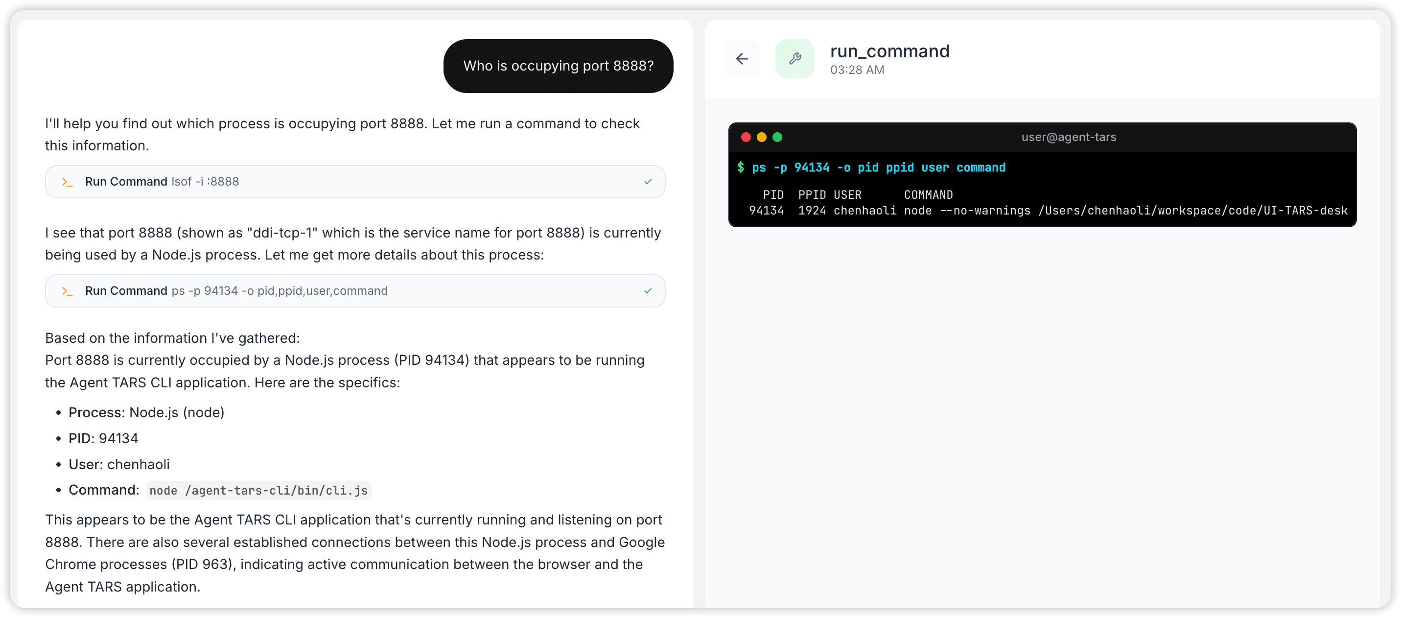 Agent TARS helps you find that an application called Agent TARS CLI is occupying port 8888:
